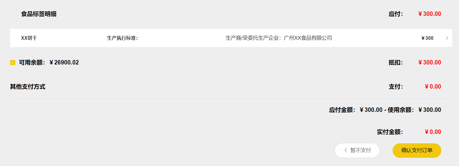 在完成标签的提交后,将进入订单支付页面,在该页面,您将能了解到: